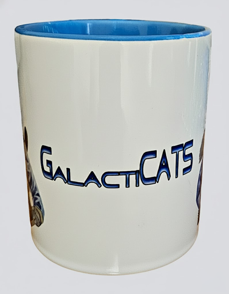 GalactiCats coffee mug - blue. Characters on mug: Chunky & Marble.